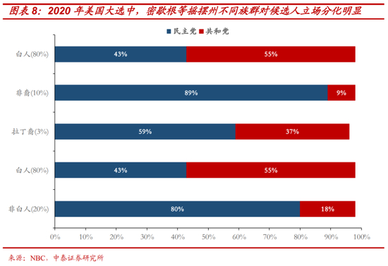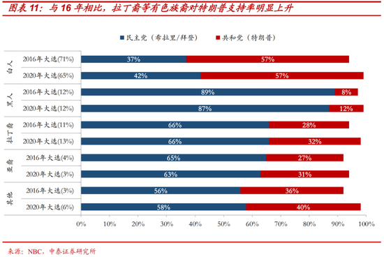 2)低估了拉丁裔、非洲裔、亚裔等少数族裔的投票倾向的变化,CNN等部分偏民主党的民调,按照历史规律,倾向于认为上述少数族裔都是民主党的“铁盘”,尤其是在今年“佛洛依德黑人骚乱”事件后更应如此。而实际上,今年选举中出现的一个新特点就是“族裔政治”和“身份政治”趋于淡化:与2016年相比,特朗普在黑人中的支持率从8%上升至, 12%;拉丁裔对特朗普的支持率由2016年的28%,增加到32%。这种变化同样也体现在亚裔和其他族裔对特朗普支持率的大幅增加上。如果具体到竞争激烈的关键摇摆州,上述趋势变化更为明显,甚至成为左右该州选举胜负关键:佛罗里达州和德克萨斯州分别有47%和40%的拉丁裔选择支持共和党,大幅超越民调的预期。这也是民调在上述关键州中明显低估了特朗普表现的另一个重要原因。(另一方面,传统的共和党基本盘白人和老年人本次对特朗普的支持率也出现下降,其支持率从2016年的63%下降至今年的55%)