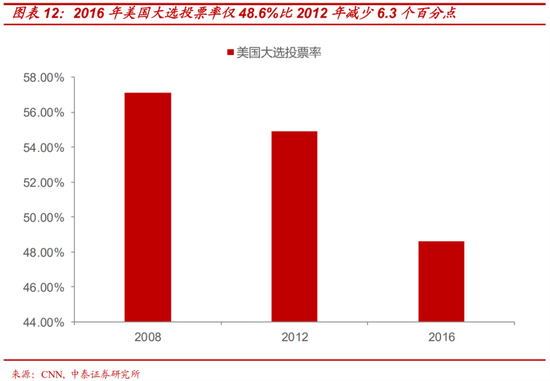 从2016年大选投票率的数据上可以看出:有高达47.8%的选民没有去投票,投票率和往年相比再次降低超过5%,这其中,特朗普方面与2008年,2016年大选中共和党得票数量基本保持了一致,发挥了共和党的正常动员能力;而民主党方面则相比前两届大幅缩水500万选票以上,也就是说,民主党选民相比08、12年投票热情大幅下降是造成整体投票率较低的主因。