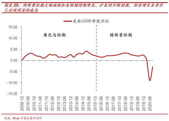甚至在疫情前,尽管有大幅减税和美联储持续降息、扩表的不断刺激,经济增长本身亦已出现明显的疲态:特朗普执政前三年的美国经济年均增长率为2.5%,这与奥巴马政府最后三年的增长水平相近(2.3%),而2019年美国GDP增速已从一年前的2.9%降至2.3%。