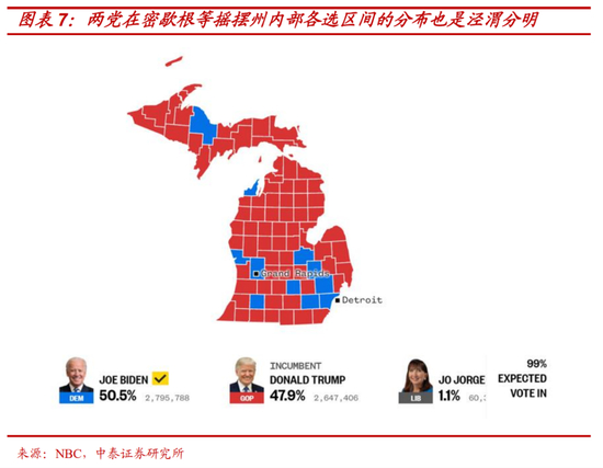 第二,关键摇摆州计票过程中的候选人选票频繁“跳升”的本质是摇摆州内不同选区泾渭分明的选民构成与开票顺序差异。事实上,与直观上理解的各摇摆州州内选票分布较为平均,开票数达到一定比率(比如:50%以上),就可以看出胜负不同,各关键摇摆州内不同选区的政党倾向可谓泾渭分明,且不同选区开票时间上的差异也是每年固有的,再加上每年双方候选人的差距都极其微弱(1%)以内,所以计票过程中选情多次反复,不到最后一刻难定胜负实际是个常态。
