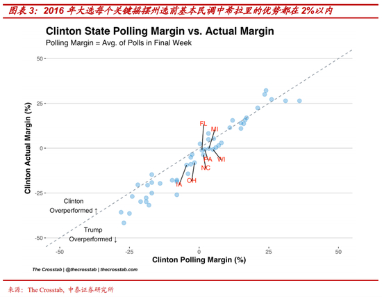 2016年选举在全国普选票劣势下,特朗普最终以50余张选举人票的优势翻盘的原因在于美国最重要的个关键摇摆州:佛罗里达、宾夕法尼、俄亥俄等,大选真实结果与民调预测的差异亦都在3%的历史平均水平以内。唯一值得注意的是,与一般的随机误差不同,这些关键摇摆州最终选举结果相对民调都略微向特朗普倾斜了一点。实际上,2016年大选每个关键摇摆州选前民调都十分焦灼(基本民调中希拉里的优势都在2%以内),而特朗普最终在每个关键摇摆州都在民调数学模型允许的误差范围内以极其微弱的优势(1%左右)“逆势翻盘”。单从统计意义上看,特朗普2016年的获胜只是民调误差允许范围内一场不折不扣的“奇迹”。