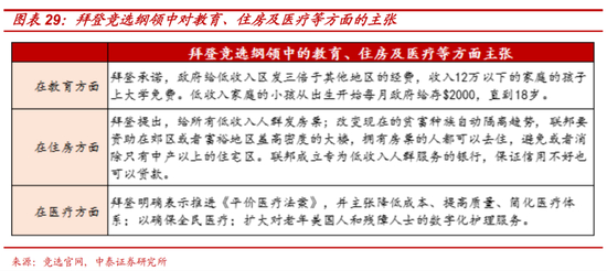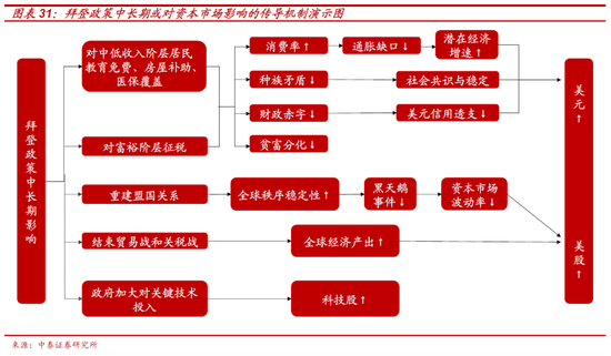 通过在教育、医疗、住房方面大幅减轻中低收入阶层的负担,美国消费率整体或有所提振并弥合日益扩大的“通胀缺口”,从而提升美国经济潜在增长率;族裔矛盾的缓和,又将促进美国社会“新共识”的形成,并稳定秩序;同时,政府税收能力的增强也将在一定程度上弥合美国巨额的财政赤字和避免美元信用的过度透支,叠加全球贸易关系的缓和及盟国体系的稳定,我们认为,美股的中长期前景或也并不悲观。