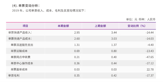 图表2:圆通速递2019年财报披露的单票成本变动情况