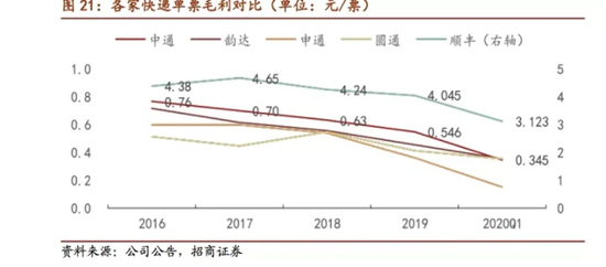 仅仅以上市公司的财务报表来看,上市公司已将发条拧紧。招商证券研报统计,各家快递单票毛利在快速降低。