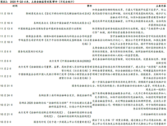 (2)防范金融风险有序推进,尤其是9月份以来,国家从监管层面明确金融科技和金融创新的金融本质,将其逐步纳入金融监管体系,金融科技监管开始趋严。近年来,以蚂蚁金服为代表的金融科技概念企业呈现高速增长,行业因监管缺位+高倍杠杆等,存在普遍的监管套利空间、隐藏较大的金融风险。为保证其业务合规、风险可控,9月13日发布的《准入决定》和《金控办法》将金融科技企业纳入金融机构一致性监管体系,“对同类业务、同类主体一视同仁”;10月30日的金融委会议是金融科技迈入严监管时代的重要标志,会议从“增强金融普惠性”、“全面纳入监管”、“反垄断和反不正当竞争”、“加强消费者个人权益保护”等角度正式定调金融科技发展方向,并于11月陆续出台网络小贷管理办法、平台经济反垄断、建立反不正当竞争部际联席会议制度等具体措施,我们预计未来围绕完善金融科技监管体系的相关措施有望逐步补齐。