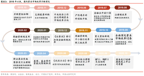 近十年,我国资本市场一直处于改革和开放的过程,尤其是2018年10月以来,资本市场改革不断深化、金融供给侧改革不断深入,形成许多重大突破。2018年10月推出的“小额快速”并购重组审核机制、配套融资和再融资用途拓宽等,有助于多渠道支持上市公司改善现金流、发挥协同效应;2019年2月发布的《关于加强金融服务民营企业的若干意见》,强调加大直接融资支持力度;2019年7月首批科创板正式上市,是注册制增量市场改革的先行者;2020年2月出台的《再融资新规》,利于优化战投制度、吸引战略投资者;2020年3月新《证券法》正式生效,从基础制度变革推动发行、交易、信息披露、投资者保护的根本革新,强调让市场发挥主导性作用,充分把选择权交给市场;2020年4月发布的《关于构建更加完善的要素市场化配置体制机制的意见》,提出深化要素市场化配置改革;2020年8月创业板注册制的试行迈出了存量市场改革的第一步。