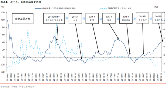 近十年来,我国金融监管体系也在不断完善,以期督促金融服务于实体经济。我们以信用扩张/收缩(社融增速)作为国内金融监管的刻画指标,金融监管大致历程表现为:2013-2014年影子银行/银行同业业务整顿→2015年股市去杠杆→2016年P2P整治→2017年债市去杠杆→2018年资管新规出台、股权质押风险暴露→2019年包商银行事件→2020年金融科技监管加强。
