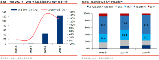 但当前我国直接融资与间接融资之间发展仍然不平衡,金融资产风险主要集聚于银行等金融机构,而相当部分的金融风险是由政府部门承担。金融的本质是服务实体经济,由于我国直接融资市场起步晚等原因,当前国内仍以间接融资为主,这影响了金融服务实体经济的效率和效果,根据央行数据(2020.11.16 央行发布的易纲文章《再论中国金融资产结构及政策含义》),2018年我国直接融资规模(以股票、债券等资产表征)占GDP比重相比2007年下降31.4个百分点至136%。与此同时,我国金融资产风险主要集中于银行等金融机构,且相当部分的金融风险最终是由政府买单,根据央行数据,2018年金融机构、政府承担风险的金融资产规模占全部金融风险资产比重分别为54.5%、17.7%,合计达72%,其中金融机构承担金融资产风险占比相比2007年增加14pct。