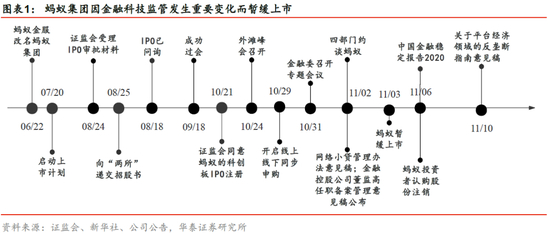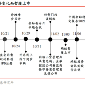 A股史上最大IPO因金融科技监管政策发生变化而暂缓。蚂蚁金服于2020年8月25日正式递交科创板IPO申报稿,于9月18日成功过会,用时仅25天,A股IPO募集规模1322亿元,为A股历史上最大IPO。原本蚂蚁金服将按既定程序顺利上市,但由于金融监管政策发生显著变化而暂缓上市。10月23-25日,上海第二届外滩金融峰会上,马云发表演讲,“巴塞尔协议”、“银行当铺思维”等引起社会各界广泛讨论。11月2日,银监会和中央银行相互公布《网络小额贷款业务管理暂行办法(征求意见稿)》;同日,一行三会、外管局就对蚂蚁集团实际控制人、董事长和总裁进行了监管约谈;11月4日,蚂蚁集团正式发布暂缓上市的公告。