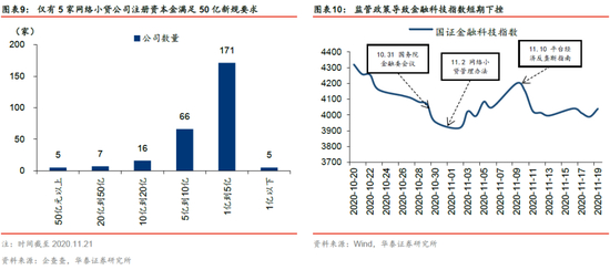 自10.31金融委会议以来,金融科技监管持续升级、“监管沙箱”机制逐步推行,金融科技行业格局有望重构(尾部出清+头部集中),盈利空间或将明显收缩,头部金融科技公司估值有望重塑。对于金融科技行业整体而言,行业准入门槛提高、业务范围受限,行业格局有望重构。据企查查数据,我国目前(截至2020.11.21)网络小贷公司240余家,其中满足50亿元注册资本金要求的仅有5家,绝大部分网络小贷公司注册资本金在10亿元以下。在“跨省经营注册资本金不得少于50亿元”的网贷新规下,网络小贷行业或将迎来一大批中小规模企业的退出和转型,行业格局趋向集中化(头部集中)、规范化发展。网贷新规、平台经济反垄断等金融科技监管政策陆续出台背景下,金融科技公司的商业模式、盈利模式都将受到冲击,获利空间或将明显压缩,如网贷新规限制了联合贷款杠杆率(联合贷款自营资金不得以低于30%)等,影响了联合贷款模式运作;平台经济反垄断征求意见稿有利于促进行业公平竞争,而由于未来行业的发展、市场份额的争夺主要取决于公司的综合竞争力尤其是科技实力、研发实力等,而头部集团则更具优势,行业竞争格局或难因此发生颠覆性变化。长期而言,伴随监管定调金融科技要回归金融本质,已有监管新规下盈利结构重构+未来面临的更严监管风险或引发市场对金融科技公司估值重塑。