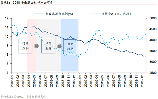 根据国内历次金融监管加强时期股票市场表现(如2013年钱荒、2018年金融去杠杆等),我们认为金融监管政策对股票市场的影响节奏主要有三层:情绪压制→流动性偏紧、风险暴露→盈利冲击。以2018年金融去杠杆为例,2018年4月资管新规正式出台,意在打破刚性兑付、降杠杆、去通道、消除多层嵌套等,短期对市场风险偏好形成了压制,后伴随金融机构去杠杆导致流动性紧张、刚性兑付逐步打破下风险定价更加有效,信用违约事件频发,期间叠加中美贸易摩擦等因素,股票市场出现大幅下挫,股票质押风险提升,并形成恶性循环,最终对企业经营形成了损伤。在此背景下,国务院副总理、一行两会领导等共同发声,指出政府高度重视股市的健康稳定发展,相关部门研究出台改革措施,地方政府、金融机构等采取措施帮助纾解股权质押困难,这一事件负面冲击才得以逐步缓解。
