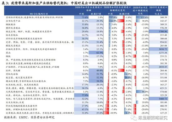 疫情给国内机械制造切入海外市场带来契机,中国对美出口机械制品份额扩张较快。前文提及疫情期间中国制造对疫情更严重的欧美地区生产替代效应更强,东南亚地区全球出口份额变化并不显著。我们以HS两位编码分行业拆解2020年6-9月美国进口商品来源地供应份额的变化,发现机械制品行业中国对美出口份额扩张,而在家具、玩具等国内传统出口优势行业中,中国出口份额是降低的。
