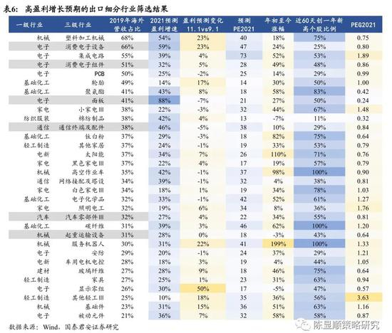 高盈利预期出口细分行业筛选。我们通过以下标准进一步对中信三级行业进行筛选,以寻找高盈利增长预期的出口细分行业:(1)中信一级行业限定为出口相关的制造业,包括机械、电子、通信、家电、化工、纺服、电新、建材、轻工及汽车;(2)2019年末海外营收占比超20%;(3)一级行业为机械,2021年行业预测盈利增速大于0且三季报公布后2021年盈利预测较中报进一步调升,或2021年行业预测盈利增速大于20%且三季报公布后2021年盈利预测较中报进一步调降幅度低于10%。通过以上标准我们筛选出32个三级子行业,筛选结果中电子、机械、化工类细分行业出现频次较高。结合行业交易拥挤度和2021年PEG,我们认为32个细分行业中消费电子、面板、通信终端设备及配件、汽车零部件、起重运输设备配置性价比更高。