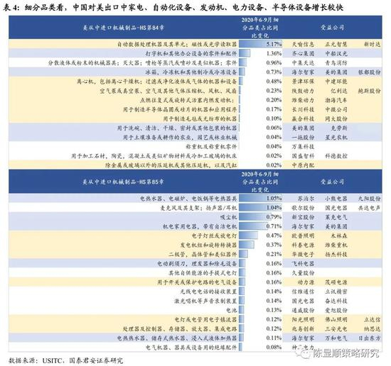 在美国进口规模TOP30(以2019年进口额衡量)的行业中,金属(钢铁、铝)制品、核反应堆、锅炉、机器、机械器件及零件、车辆及零件行业,中国对美出口份额扩张较快,同时欧盟出口份额则出现下滑。特别是美国进口第一大子行业核反应堆、锅炉、机器、机械器件及零件,在2020年6-9月进口规模总体同比下滑3.9%的基础上,中国市场份额上升了4.1%,欧盟的市场份额却下滑了4.4%。进一步看细分品类,中国对美出口中家电、自动化设备、发动机、电力设备、半导体设备增长较快。我们认为以上情形背后的原因是发达国家原本是高附加值产品的主要供给国,但受疫情影响生产商供应不足甚至停产,部分订单转向中国供应商。