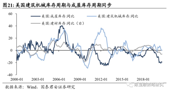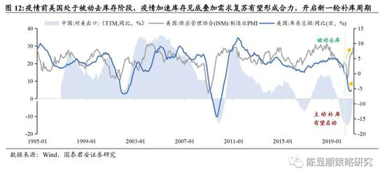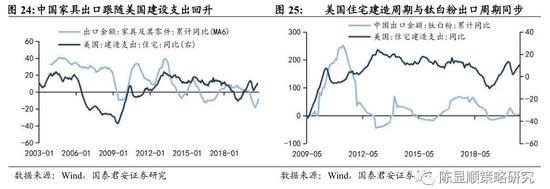 美国地产进入补库周期,支撑地产施工(建材/工程机械)和地产后周期消费(家具/家电)出口链回暖。拉长时间轴看,2010年至今美国出现三轮地产库存周期,分别为2009.05-2012.09,2012.10-2016.06,2016.07-2020.07),平均一轮库存周期时长是45个月左右。地产施工建设周期要领先库存周期约一年半,最近一轮美国住宅建造支出同比的向上拐点出现在2019年2月,按滞后关系推断库存拐点约在2020年年中,与当前月度供给实际见底一致。历史上美国房屋库存周期与工程机械、建材库存周期同步。当美国建设机械行业补库时,中国工程机械对外出口也往往出现回升,同时家具、钛白粉出口额跟随美国住宅开支的增加而扩张。