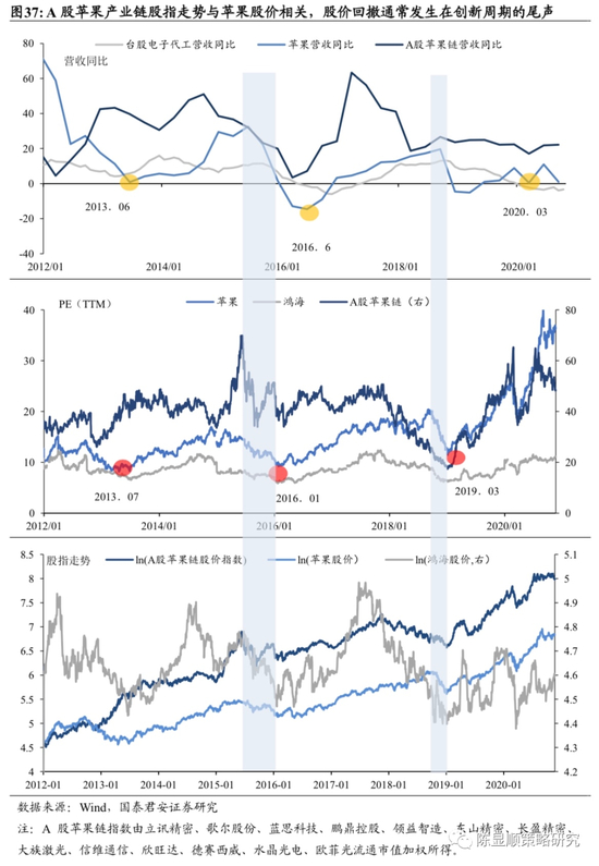 A股苹果产业链股指走势与苹果股价相关,股价回撤通常发生在三年产品周期的尾声。2010年以来苹果营收呈现三年左右的周期性波动,A股苹果产业链和中国台湾电子代工业营收周期与之大致同步。A股苹果产业链由于代工和零部件份额不断扩张、营收增速高于台股电子代工业,股指走势不同于鸿海(富士康母公司)的强周期性波动,展现出与苹果股价相关成长趋势。苹果估值周期领先于营收周期,股价回撤通常发生在三年产品创新周期的尾声。5G新品迭代、三年换机周期、可穿戴产品渗透、疫情导致需求后置,四大因素共振驱动苹果进入新一轮强劲营收增长期,看好A股产业链优质个股跟随成长机会。