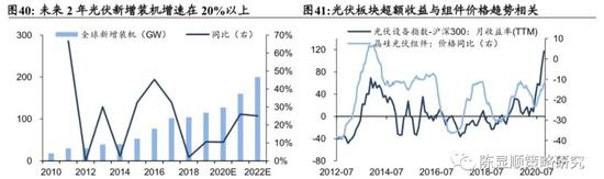 全球碳中和目标升级,光伏预计成为新电力支柱。全球碳减排进程加速,中国做出30/60承诺,欧洲加大减排力度,同意2030年温室气体排放在1990年基础上减少60%。拜登当选美国总统,其清洁能源革命计划在2050年美国实现净零排放。全球碳中和目标升级,可再生能源成最大受益者,光伏预计成为新电力支柱。IEA预期2050年全球实现净零排放情景下,2025年光伏装机容量将达到300GW,2030年达到500GW,对应2019-2030年全球太阳能光伏装机容量增速约为20%左右,中长期成长确定性较强。A股光伏板块超额收益对组件价格敏感,四季度硅料和光伏玻璃供应紧缺先后带动产业链涨价,短期玻璃产能难释放,若价格进一步上涨可能会继续催化光伏行情。