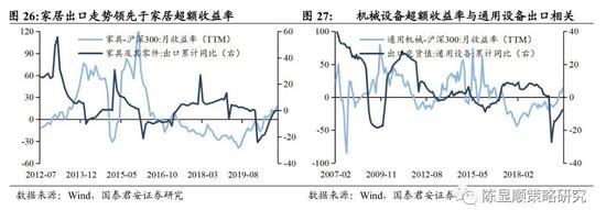 家居、机械历史超额收益与行业出口趋势相关。2017年以前家具出口趋势领先于申万家具行业指数超额收益率(相对沪深300),2017~2019年期间两者走势背离,原因与行业结构变化及国内地产限购有关。2017年定制家居品牌密集上市,地产销售数据弱势压制家居板块估值。2019年中旬地产竣工回升带动家居板块反弹,竣工交付刚性压力使得内销市场对估值的压制解除,看好海外补库拉动外销出口,家居板块有望延续上涨趋势。此外,机械设备超额收益率亦与通用设备出口相关。