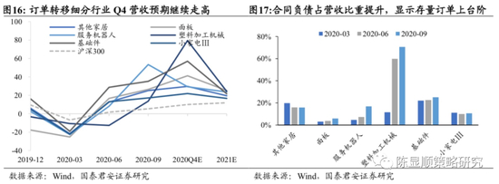 机械制品借力切入新供应链体系,订单粘性带来长期份额提升,相关赛道关注机械设备(办公设备/通用设备/工业设备)、电子元器件、小家电。疫情期间供给替代给出口制造商切入新客户供应体系的机会,海外订单回流见诸于家电、医疗器械、通用设备(手工具、阀门等)等制造行业,中国出口制造得到被全球客户发现并认可的契机,我们认为供应认证门槛高、高附加值产品的订单转移更易转化为长期份额提升,机械装备符合这一特征。结合Q3上市公司财务数据,海外订单回流细分行业,如家居、服务机器人、小家电、基础件等,预期Q4营收同比延续走高,2021年细分行业营收预期亦高于2019年末,同时多数行业合同负债占营收比重在Q3明显提升,显示存量订单上台阶,以上迹象侧面反应海外回转订单具备一定持续性,相关行业赛道关注机械设备(办公设备/通用设备/工业设备)、电子元器件、小家电。