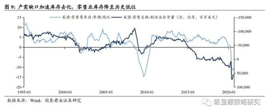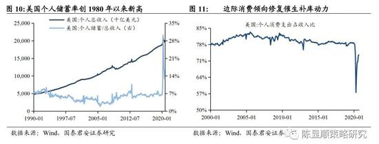 私人部门储蓄率位于高位,边际消费倾向修复催生补库动力。在3月CARES法案提供的系列现金补贴之下,美国居民个人收入陡升,个人储蓄率创1980年以来新高,但受百货等公共娱乐场所开放限制,个人消费支出占收入比例比较过去10年均值低4.9个百分点。随着疫情缓和及摩擦性失业改善,边际消费倾向回升亦将从需求端催生补库动力。