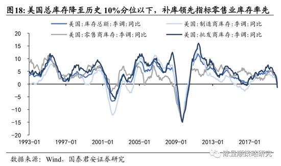 美国总库存降至历史10%分位以下,补库领先指标零售业库存率先回升。截至2020年8月,美国库存总额同比增速已降至1993年以来历史6.9%分位水平,零售、流通环节库存下滑幅度远高于生产环节,这与消费复苏先于生产端相互验证。历史上零售业库存同比领先于批发和制造商库存波动,6月零售商库存率先回升,7月批发库存见底,预计制造业库存将跟随回补。