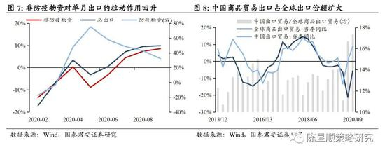 产需缺口扩大推动欧美进口回升,中国制造彰显供给替代优势。产需缺口扩张推动美国商品进口需求回升。由于疫情错位和防控得力,中国工业生产在修复时点和恢复程度均领先全球,先发优势使得中国出口份额在全球贸易中逆势扩张。特别是5月后非防疫物资对单月出口拉动作用持续回升,表明中国出口对全球供应链发挥的作用已经由“补缺(防疫物资)”转向“供给替代(非防疫物资)”。
