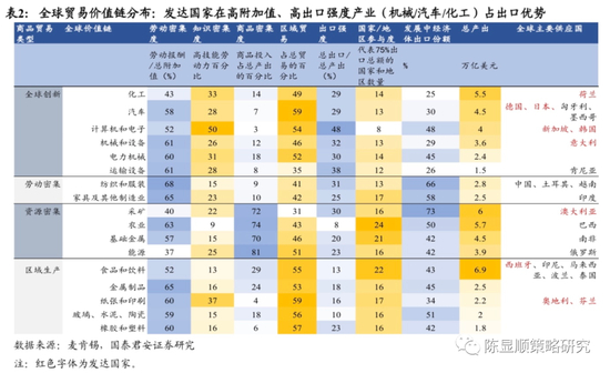 回顾疫情前全球贸易价值链分布,发达国家高附加值、高出口强度产业占据出口优势。根据麦肯锡2019年对全球商品贸易的研究显示,汽车、计算机和电子、机械等行业催生了全球价值量最大、出口产值比最高、知识最密集的商品贸易价值链,以上行业产值占全球总产出的13%,但总出口占总产值比例高达35%。这些高附加值、高出口强度的主要出口国集中于少数发达经济体,平均而言12个国家占据此类价值链75%的出口量,发展中国家的出口份额仅占34%。中国在纺织、服装、玩具、鞋履和家居制造业等劳动密集型产业占据出口优势,此类价值链的特点为出口强度高(62%)、产值占比低(3%),同时中国在全球创新价值产业链影响在加大。