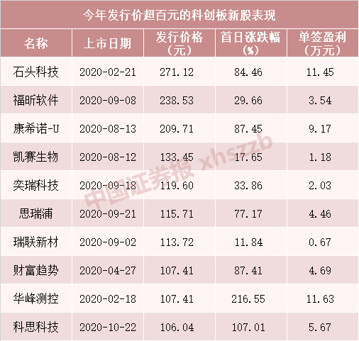Wind数据显示,在今年上市的科创板新股中,发行价超过百元的共有10只,上市首日收盘平均涨幅为75.31%。单签盈利最高的是华峰测控和石头科技,均超过了11万元;单签盈利最低的是瑞联新材,不足万元。