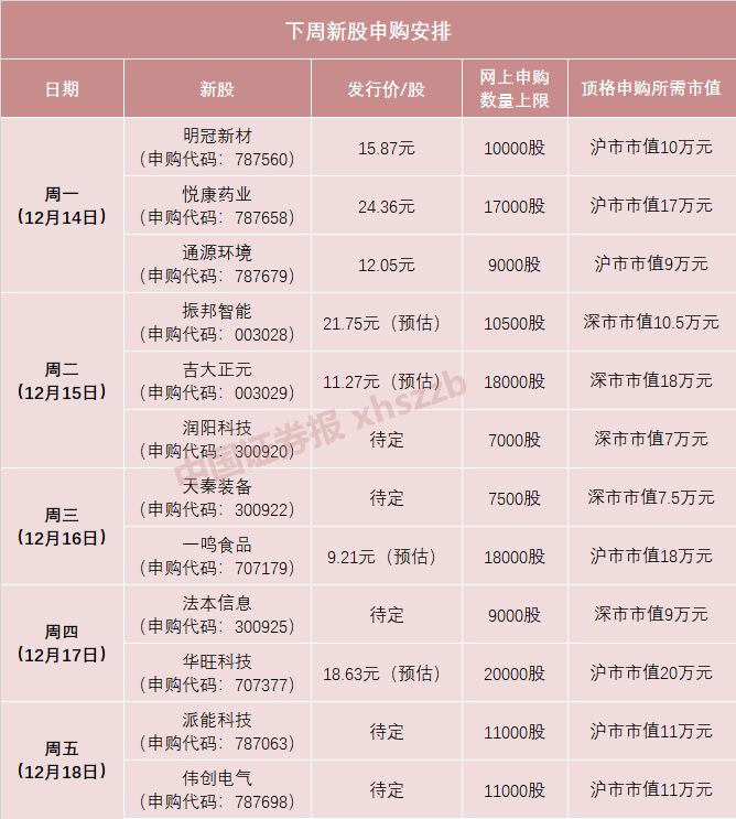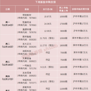 根据新股发行安排,下周(12月14日至12月18日)A股将有12只新股申购,包括沪市主板2只、科创板5只、中小板2只、创业板3只。