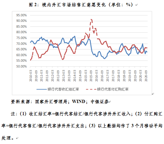 在汇率灵活性增加的情况下,汇率既可能涨也可能跌,且汇率市场化程度越高,汇率走势越难预测。这种情况下,市场一般不会单边赌汇率走势,而是低(升值)买高(贬值)卖。近年来,我国境内外汇市场也初步呈现这种市场特征。今年前5个月,人民币汇率总体承压,但到5月份,3个月移动平均的银行代客收汇结汇率较上年底上升了8.9个百分点,付汇购汇率回落了2.8个百分点。之后,人民币汇率持续震荡走高,但到10月份,银行代客收汇结汇率较5月份回落了7.0个百分点,付汇购汇率上升了4.3个百分点,显示有购汇需求者借人民币持续升值“落袋为安”。
