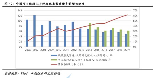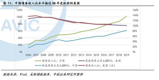 目前中国家庭债务收入比仅为美国07年水平的一半。但近年来我国的可支配收入并没有跟上家庭债务的增长速度。根据中国国家统计局的统计,我国的工资增长速度正在放缓。2019年,经通胀因素调整后,中国城镇居民家庭人均可支配收入同比增长5%,和18年相比下降0.6%。农村地区的增幅为6.2%,和18年比下降0.4%。而2016至2019年我国家庭债务占GDP比例的年增长率为9.2%。以家庭债务收入比来衡量,我国现在的债务水平正在接近危机前的美国。2019年,我国城镇居民家庭的平均债务收入比为1.02,美国危机前的家庭债务水平为1.37。