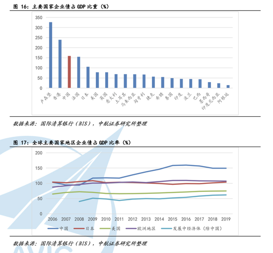 相比于家庭债务,我国的企业债务是一个更加棘手的问题。企业债务主要指企业为给投资与运营筹措资金而获得的银行贷款或发行的公司债券。自2008年以来,中国的企业债务一路飞速攀升,10年时间里我国企业债占GDP比重增长了55个百分点,是主要经济体中增长最快的。截至2020年第一季度,中国大陆地区企业债务已达GDP的159.1%,虽不及中国香港,但远超日本与美国。同时,中国的企业负债水平也远高于巴西、马来西亚等其他新兴市场伙伴国家。
