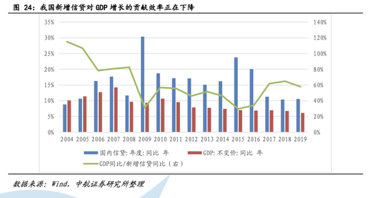 在政府以支持经济增长为目的的鼓励下,地产、基建等固定投资拉动了金融危机后中国经济的第一轮反弹。GDP增速从09年初的6.4% 反弹至10年初的12.2%。但随着实体经济债务继续扩张,产能过剩、实体投资回报率变低等问题开始显现。2009年到2015年,中国的信贷总量平均每年增长约20%。远高于名义GDP的增长以及此前的信贷增长趋势。08年全球金融危机后大规模财政刺激叠加宽松的信贷政策加大了房地产市场的泡沫和经济供需失衡,让中国经济面临了严峻考验—一旦出现局部资金链断裂并传导到金融市场的其他部分,中国经济可能将陷入类似于20世纪90年代时日本的衰退。这些副作用都让我们此后多年不得不以经济放缓的代价,推进“去杠杆”和“去过剩产能”。2018年,随着中美贸易摩擦的开始,国内外需求下滑。为了保护就业、重振经济,我国政府重新鼓励银行增加放贷。地方政府和银行的借款再次开始大幅增加。企业杠杆率稳步上升,新增信贷对GDP增长的贡献效率再次下降,这反映了投资效率的下降—中国企业正越来越多地利用贷款进行融资,并承担越来越大的风险。