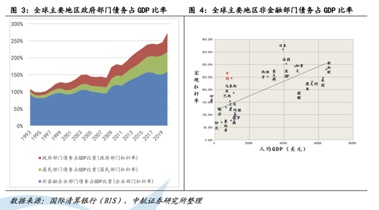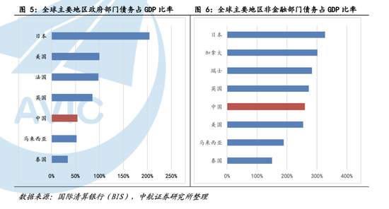 我国的实体经济债务主要包括三大部分:企业债务、家庭债务和政府债务。涵盖政府、家庭与企业债务情况的整体宏观杠杆率显示出我国债务水平偏高。一个经济体能够承担的债务与经济体发达程度成正比,我国宏观杠杆率显著高于同等发展水平国家。