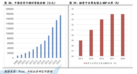 和日本相似,中国能够承担目前的债务水平而没有出现金融危机主要是由于中国人的储蓄习惯。由债务引发金融危机需要两个条件:首先是不良贷款的累积和银行资金的枯竭。不可否认,中国已经有很多不良贷款。截至2018年底,地方融资平台的带息负债超过30万亿元人民币,占GDP的比例为34%。但平台公司的偿债保障比率只有0.4倍—融资平台企业的经营性现金流不够支付到期的本金和利息。与此同时,我国信用卡循环贷款余额快速增长,这些中的一部分可能已经成为坏账。