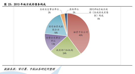 我国政府债务相对较低,远不及美国与日本。2019年,我国政府部门债务占GDP比重为54.2%,美国为99.9%,日本204.3%。但不同于美国和日本,我国政府能够通过国有企业和地方政府直接投资,根据审计署2013年年底的公布的《全国政府性债务审计结果》(迄今为止有关地方政府债务最全面的数据),融资平台公司是当时地方政府债务最大的举债主体,共举借40755.54亿元,占地方政府债务余额的37%。由于国有企业和地方政府的表外融资被列为非金融企业债务并不计入政府部门债务,并且地方政府表内融资作为利率债违约概率非常低,我们对政府广义负债的研究放在中国企业债的部分一并讨论。