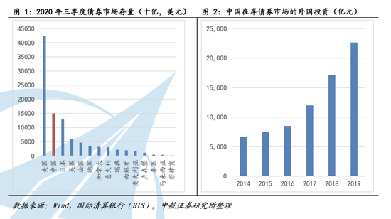 目前,我国债券市场存量规模居世界第二位,仅次于美国。从广义上讲,我国的债务可以分为国内(在岸)债务和国外(离岸)债务。自2016年我国债券市场逐渐拆除对外壁垒后,在岸债券市场的外国投资逐年增长。根据国家外汇管理局的数据,截至2019年底,包括资产管理公司、共同基金及对冲基金在内的外国投资者持有价值约2.26万亿元人民币的中国债券。尽管外国投资者对中国债券的需求逐年上升,但他们所持有的债券在中国国内债券市场中所占份额仍然很小(3%-4%)。因此,我国大多数债务仍是以人民币计价的内债。