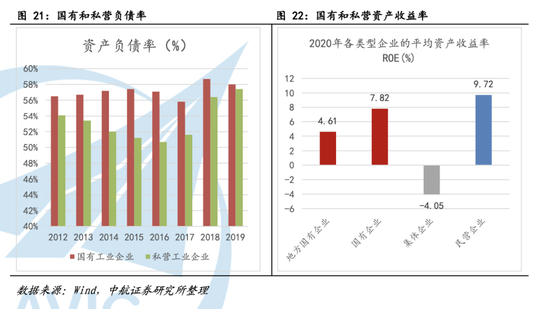 我国的国有企业多集中于传统原材料和制造业领域。相较私营企业,国有企业整体负债率更高、利润率更低。其中许多企业产能落后、无利可图。根据2016年统计,国企所持债务占中国企业债务总额的一半以上,但对中国2016年整体GDP的贡献仅为22%。部分落后产能的企业因为有各级政府托底、背书而获得了贷款,没有被淘汰掉,他们变成了中国的“僵尸企业”并造成了某些领域的“国进民退”(信贷资源集中在央企和地方政府,对民营企业造成了挤出效应)。此外,由于08年后的我国出口转弱,市场需求不足,流向这些“僵尸企业”的信贷造成了原材料和制造业产品产能过剩的问题。