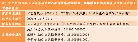 新型烟草已成为各烟草巨头的重点发展方向,公司已在生产、技术、人才等方面提前积极布局。2020年上半年公司自研的多款雾化电子烟产品,已经销往美国、俄罗斯、希腊等国家;低温不燃烧烟具产品已经销往南非。公司与云南中烟合资成立的嘉玉科技承担了云南中烟新型烟草烟具的生产工作;子公司劲嘉科技为云南,贵州,广西,上海,河南等中烟客户提供新型烟草烟具的研发、生产等服务,同时凭借前期的专利和生产研发经验积累,开展ODM/OEM服务。我们认为,随着国内监管的逐步落地,有资质、生产规范、技术成熟的龙头企业将脱颖而出,享受新型烟草蓝海市场,新型烟草也有望成为公司新的利润增长点。