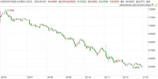 值得注意的是,2020年12月底,在岸、离岸人民币对美元汇率曾创下逾两年半新高。2020年12月31日上午盘中,离岸人民币对美元汇率最高涨至6.4895元,创2018年6月22日以来新高;同日,在岸人民币对美元汇率最高涨至6.5148元,创2018年6月25日以来新高。