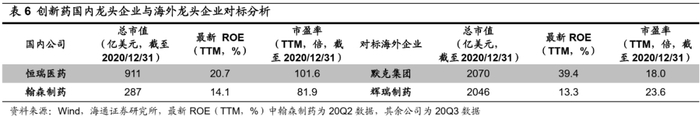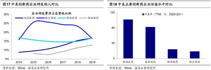 中国创新药行业规模较小,以恒瑞制药为代表的国内药企研发实力不足。创新药是高技术壁垒、高资本壁垒的行业,药品研发投入大、周期长、风险高,唯有具备一定经济实力和研发能力的大型企业才能承担创新药研发的高风险和高投入。中美创新药企业规模相差巨大,国内企业如恒瑞医药、翰森制药,总市值分别为911、287亿美元,较美国的辉瑞制药(总市值,下同:2046亿美元)、默克集团(2070亿美元)差距较大。除市值规模外,生物制药研发投入和科研实力也相差悬殊,中国公司尚未在此行业形成自己的竞争力,2019年恒瑞医药、翰森制药研发投入为5.6、1.6亿美元,而美国默克集团、辉瑞制药研发投入为98.7、86.5亿美元。创新药行业向来是受投资者瞩目的高科技产业之一,国内相关公司规模未成,盈利也低于美国龙头制药企业:20Q2恒瑞医药、翰森制药ROE为21.0%、14.1%,低于默克集团(37.9%)、辉瑞制药(22.0%)。但近年来以恒瑞医药为代表的中国药企开始重视研发,2019年恒瑞医药研发投入占营业总收入的比重已达16.7%,在国内主要创新药公司中首屈一指,达到了美国先进医药企业的平均水平。