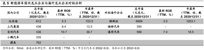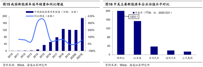 新能源车浪潮或是中国打造世界级车企的良机。政策扶持下,中国新能源车产业蓬勃发展,基础充电设施建设加速。新能源车电子三大件技术中,中国电池技术已处于全球领先水平,电机已基本实现国产替代,电控核心零部件取得突破。龙头车企市值规模和盈利能力方面,中美有较大差距。美国电动车及能源公司巨头特斯拉的市值6689亿美元,远高于国内龙头企业比亚迪812亿美元,造车新势力蔚来762亿美元、小鹏335亿美元。国内其他新能源汽车领跑公司如上汽集团、吉利汽车,市值分别为438亿美元、336亿美元,其规模已经接近通用汽车(596亿美元)、福特汽车(350亿美元)等世界老牌车企,并且盈利成长能力较后者更好。20Q3比亚迪、上汽集团ROE为5.3%、8.4%,高于美国车企特斯拉的3.5%。我国新能源汽车企业盈利能力、企业规模在稳步提升,但总市值与海外龙头车企仍有差距。当前国内外新能源汽车各项技术基本处于同一起跑线,而中国具有市场规模和政策支持等独特优势,根据海通分析师预测2021年新能源汽车销量有望冲击190万辆、同比增长58%。因此中国可以借助新能源车推广应用这一良机,打造世界级车企。