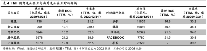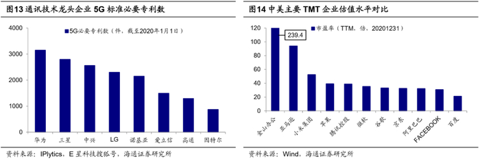 中国TMT企业与美国龙头相比仍有差距,但华为、腾讯等正加速崛起。近年来国内TMT企业赶超国际先进水平势头正盛,但中国仍缺少世界级的TMT企业。截至20201231,全球最大搜索引擎公司谷歌总市值达11855亿美元,而国内相对应代表性公司百度总市值仅738亿美元,总市值看两者量级区别显著;20Q3百度ROE(TTM,下同)13.4%,低于谷歌的16.8%。软件行业中,微软公司总市值达16816亿美元,远高于我国企业金山办公总市值290亿美元;20Q3微软ROE高达40.4%,金山办公仅为12.1%。知名电商亚马逊总市值达16342亿美元,我国国内排名前列的电商平台阿里巴巴、京东市值仅6244、1376亿美元;20Q2阿里巴巴和京东ROE分别为15.2%、16.0%,与亚马逊17.9%相差不大。在互联网社交平台方面,腾讯控股总市值为6978亿美元,与FACEBOOK总市值7780亿美元差距不大;20Q3腾讯控股ROE为21.2%,与FACEBOOK 21.5%相差无几。智能终端品牌公司苹果总市值达22560亿美元,而我国智能手机企业小米集团总市值仅1079亿美元。从营业总收入来看,苹果2019年营收达2602亿美元,华为、小米仅为1316、295亿美元;但从全球智能手机市占率来看,20Q3小米手机市占率达到13.2%、高于苹果手机市占率,华为手机市占率为12.5%、与苹果手机市占率持平。同时,华为在通信领域技术实力和发展水平位于世界前列:根据E星科技搜狐号援引IPlytics数据,截至2020年1月,华为掌握5G标准必要专利3147件,处于全球领先地位。TMT领域的技术发展得到国家和企业的高度重视,未来随着工程师红利和市场规模红利进一步显现,中国必会出现更多的世界级TMT企业。