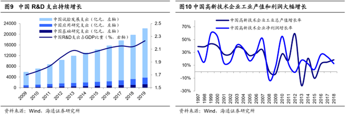 技术层面:云计算、大数据、5G、人工智能等正掀起新一轮的技术革命。本次技术革命中,我国正逐步走向世界前列,R&D研发支出中,基础研究、应用研究、试验发展齐头并进,2019年R&D经费支出占GDP的比重为2.2%,较2009年提升0.5个百分点;发表科技论文数达195万篇,十年间年复合增长率为7.6%;高新技术企业总产值和净利润均大幅增长,2018年分别为28.9/2.6万亿。从技术产业化角度看,我国已经具备了在技术创新上开启新一轮增长的基本条件。