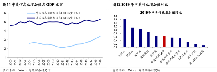 从实体的产业角度看,目前中国科技行业规模及占比与美国仍有差距。2010以来我国经济转型速度也在加快,正以产业结构优化升级为抓手,实现高速度发展到高质量发展的转变,计算机电子制造、通信、信息技术等行业加速崛起,新兴服务业高速增长。2019年我国电子信息制造业、铁路船舶及航空设备制造业工业增加值同比增速分别为9.3%、7.4%,而整体工业增加值同比增速仅为5.7%,第三产业中信息传输与软件服务业增速为16.2%,增速也显著高于2019年名义GDP的8.9%。但相比美国,我国科技产业规模仍然明显较小。从行业增加值占比看,2019年中国信息业(信息传输与软件服务业)增加值占GDP的比重为3.4%,而同年美国信息业增加值占GDP比重为5.3%;2019年中国制造业增加值占GDP的比重为27%,美国制造业增加值占GDP比重为20%。对比中美GDP规模,2019年中国名义GDP是美国66%;对比中美行业增加值规模,中国制造业、建筑业是美国的164%、114%,而中国信息技术行业增加值为美国的31%,卫生保健行业增加值为美国的19%,相对而言中国科技行业规模较小。综上所述,我国仍处于经济转型初期,科技产业还有很大的成长空间。