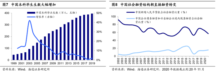 劳动力层面:中国2019年65岁及以上人口占比近12.6%,已步入老龄化社会,近年来出生人口数量连降正加快老龄化到来,劳动年龄人口占总人口比例自2010年起就呈现连续下降的趋势,中国人口红利拐点已现,劳动密集型生产模式已不再可持续,但近年来中国人口素质提高迅速,国内每年本科/硕士毕业生人数从1999年44.1/5.5万人增加到2019年394.7/64.0万,年复合增长率分别达到11.6%/13.1%,工程师红利或将取代人口红利,为科技产业发展提供了人力资本基础。