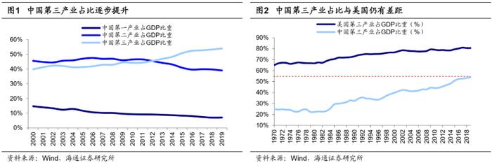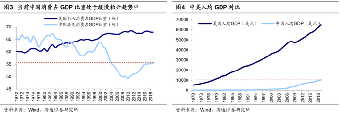 目前中国宏观经济背景类似1980年代初期的美国,处于经济转型初期。近年来,中国产业结构逐渐从过度依赖第二产业到第二、三产业齐头并进,第三产业占比从2000年40%提升至2019年54%,2019年中国第一、二、三产业占GDP比重分别为7%、39%、54%,1980年美国第一、二、三产业占GDP比重分别为3%、31%、67%,1980-2000年美国第三产业占比从67%提升至77%,因此未来在产业转型升级过程中,中国第三产业规模仍有较大提升空间。拉动经济增长三驾马车中,最终消费已经成为中国经济增长的重要动力,2019年中国消费、投资、净出口占GDP比重分别为55%、43%、2%,1980年美国私人消费、政府支出和购买、投资、净出口占GDP比重分别为62%、13%、25%、0%,1980-2000年美国私人消费占比从62%提升至66%,目前中国消费占GDP比重与1980年美国较为接近,未来消费转型过程中,消费行业规模势必持续扩大。从人均GDP看,2019年中国为10261美元,而1980-2000年美国从12547美元升至36305美元。以上指标均显示目前中国与1980年美国相似,处于经济转型初期,科技和消费行业还有很大的成长空间。