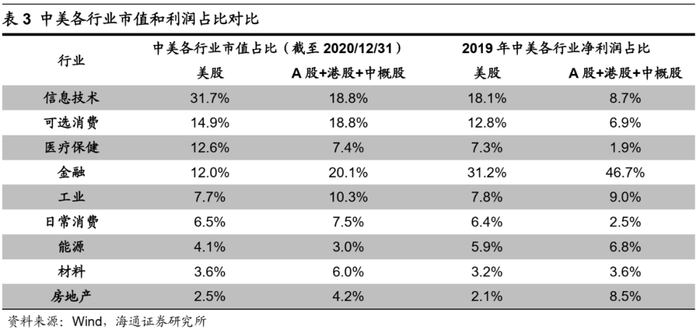 从股市结构看,目前我国科技行业市值和企业盈利占比低于美国。目前我国正在大力进行资本市场改革,2019年建立科创板、2020年创业板注册制改革都是实施创新驱动发展战略、深化资本市场改革的重要举措,将促进融资结构朝着直接融资的方式转变,鼓励科技类行业企业上市。但是从上市公司净利润和市值看,我国科技行业与美国仍有较大差距。从2019年企业盈利看,A股+港股+中概股的信息技术行业净利润为1129亿美元,仅为美股(3571亿美元)的31.6%,从2019年各行业净利润占比看,A股+港股+中概股中信息技术行业利润占比为8.7%,而美股信息技术行业利润占比为18.1%。从各行业最新市值看(截至2020/12/31,下同),A股+港股+中概股的信息技术行业总市值为4.7万亿美元,仅为美股(17.1万亿美元)的27.8%;从各行业最新市值占比看,A股+港股+中概股中信息技术企业占总市值比重为18.8%,低于美股中信息技术企业占总市值比重31.7%。从科技行业在主要指数中的占比看,沪深300中信息技术行业占比仅为15.5%,而标普500中信息技术行业占比为35.9%。无论从净利润还是市值角度看,我国科技行业规模都不及美国,随着我国经济结构转型升级持续,预计科技行业净利润和市值占比都有望扩大。