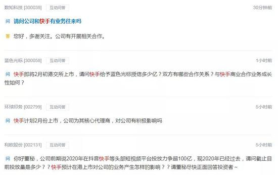 快手港股上市征途的推进,给其A股小伙伴带来不小的热度。以深交所互动易平台为例,仅1月14日至1月15日,就有逾5家A股上市公司被投资者问及与快手的业务往来情况。