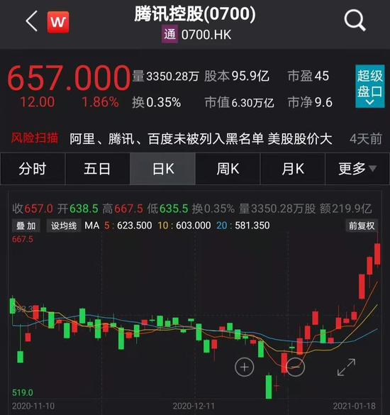 截至发稿,腾讯报收657港元,上涨1.86%,盘中一度上涨超3%,再创历史新高667.5港元/股。